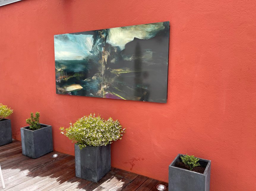 À l’intérieur de ce loft, la culture et l’art ont aussi une place importante. Pour prolonger cette ambiance à l’extérieur et habiller les murs de cette petite cour, nous avons créé des reproductions de toiles de peinture qui résistent aux intempéries. Enfin, nous avons fait une sélection de mobilier en blanc/beige pour respecter les couleurs naturelles et amener de la luminosité dans cet espace encaissé.